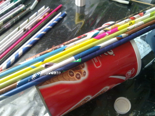 Χρειάζεστε: περιοδικά, κόλα UHU (κραγιόν) και σιλικόνης, ξυλάκι που χρησιμοποιούμε για σουβλάκια και ψαλίδι.